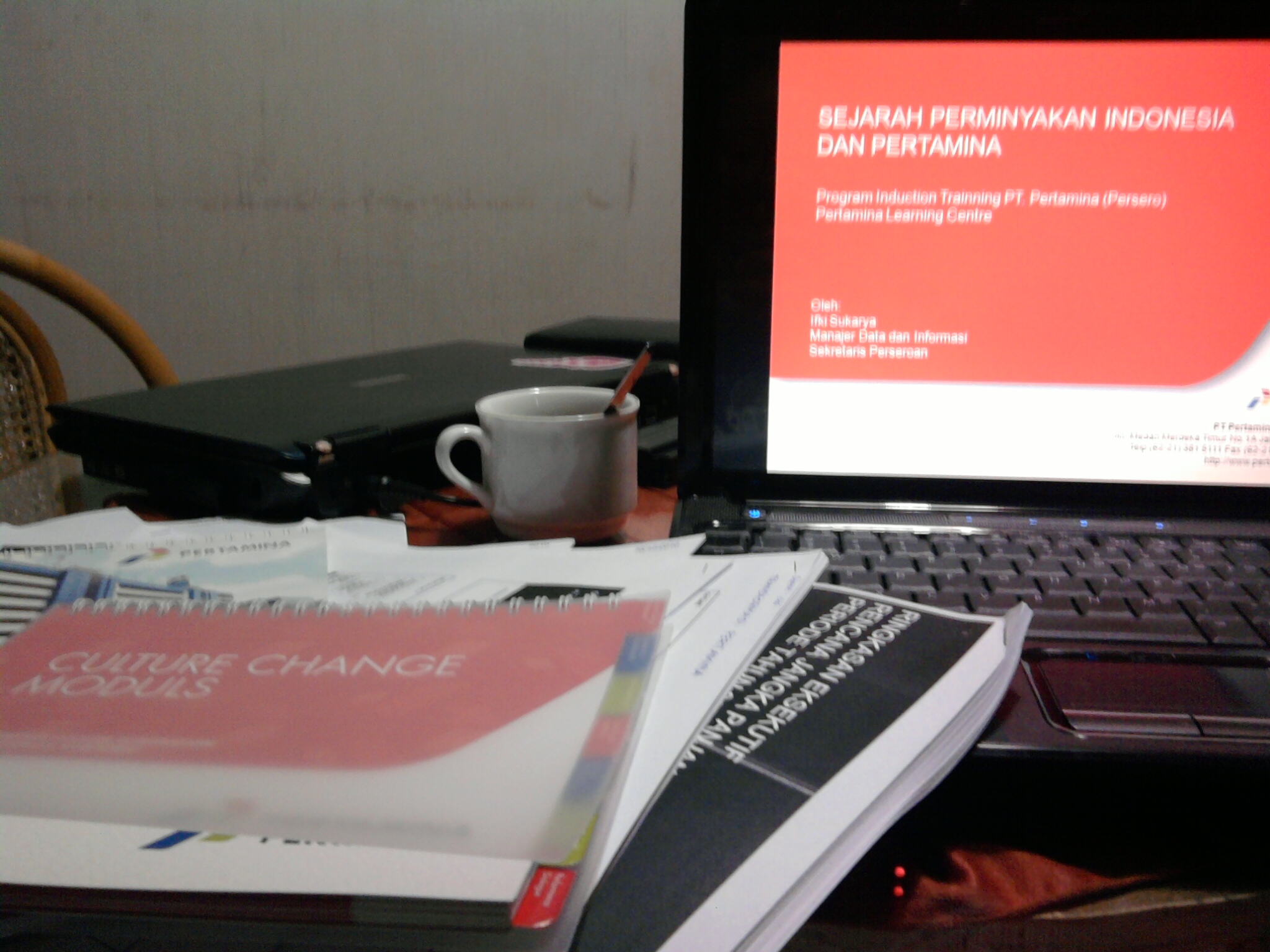 Hari senin dan selasa kemarin ada mind mapping, hari selanjutnya ada materi sejarah Pertamina, berbagai materi corporate, nasionalisme sampai dengan employee benefit yang bikin ngiler. Hari kamis malam kemarin, aku merasakan kembali jaman-jaman kuliah dulu yakni begadang sampai pagi dan hanya tidur 1 jam (jam 3-4 pagi) karena belajar untuk tes mingguan. Materinya beneran segambreng walo cuma 2 hari, ngeliatnya aja udah bisa bikin nafsu makan hilang *crossing fingers* fotokopian materinya kalo dijadikan 1 bisa jadi novel sejarah >.<. Nilai yang diperoleh harus di atas 70, kalo nggak sampai bakal dikasih tugas tambahan.