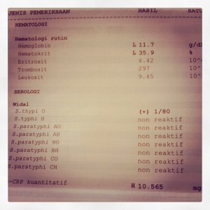 Pada tahun 2010, saya pernah di rawat inap karena gejala tipes. Otomatis saya jadi merasa parno kalau menderita demam selama beberapa hari. Ketika saya membaca “S. Thypi O” dan menunggu antrian dokter, saya mendapatkan informasi bahwa hasil lab tersebut mengindikasikan typhoid. Dari sumber lain saya mendapatkan