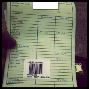 Kemarin dikarenakan khawatir atas batuk yang tak kunjung sembuh dan disertai demam, akhirnya saya pergi ke RS ini untuk periksa sekalian cek darah. Biaya untuk periksa darahnya adalah Rp 330.500 dan konsultasi ke dokternya Rp 100.000. Sedangkan obatnya adalah *drum roll* sekitar Rp 500.000 ++