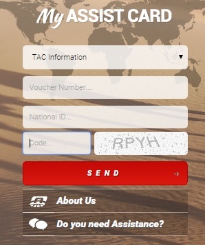 Informasi yang diperlukan untuk dapat login pada My Assist Card adalah nomor voucher, nomor passport (national ID), sementara untuk Code diisikan dengan karakter yang ada di kanannya.