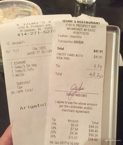 Mengenai tip, saya juga tidak terbiasa memberikan tip ketika selesai makan. Lha seringnya makan di warteg. Di sana, secara tidak tertulis, customer akan memberikan tip yang nantinya akan diberikan kepada waiter. Kata Mr. S sih biasanya 15% dari total bill. Tambahan income waiter bergantung pada tip tadi.